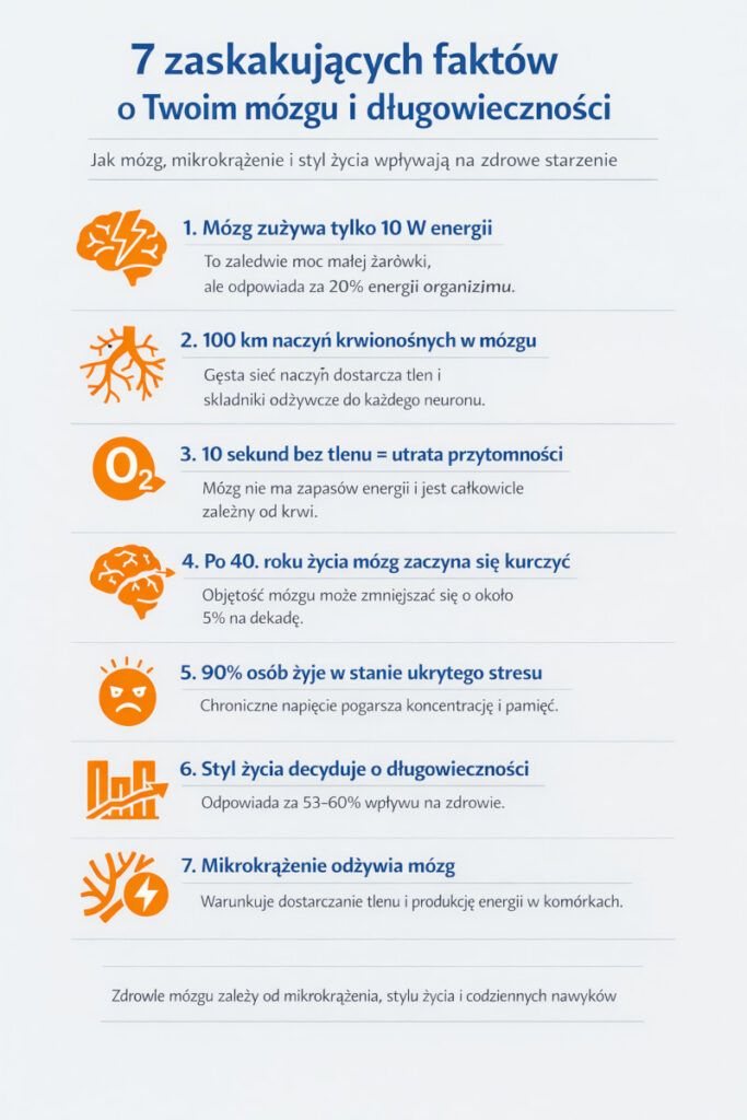 Myśląc o zdrowiu, często koncentrujemy się na sercu, diecie czy aktywności fizycznej, pomijając fakt, że prawidłowe funkcjonowanie całego organizmu zależy od sprawności ośrodkowego układu nerwowego. Jego kondycja jest ściśle związana z mechanizmami mikrokrążenia, które odgrywają istotną rolę w procesach starzenia się i utrzymania zdrowia. Dlatego sprawdź fakty dotyczące funkcjonowania mózgu i jego związku z długowiecznością.
